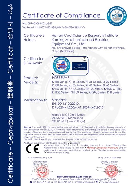 Standard:CE Number:OH180508.HCSUQ22 Issue Date:2018-05-08 Expiry Date:2023-05-07 Scope/Range:Hose Pump Issued By:Ente Certificazione Macchine Srl |